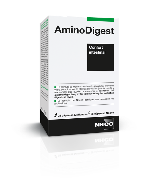 Plus d'informationsLa sensibilidad abdominal, hinchazón, espasmos o tránsito irregular, pueden tener varios orígenes, incluyendo un desequilibrio de la flora intestinal, ciertos estilos de vida o intolerancias alimentarias.Los laboratorios NHCO Nutrition® han desarrollado dos fórmulas, combinadas en un complemento alimenticio, AminoDigest, para satisfacer las necesidadesespecíficas de confort intestinal.La fórmula de Mañana combina dos complejos para el equilibrio intestinal.El complejo D-Spasm-460 contiene una combinación de hinojo, menta y manzanilla que contribuye a mantener el confort digestivo. Además, la manzanilla contribuye al tratamiento de molestias gastrointestinales, como espasmos menores, sensación de hinchazón y flatulencia y las hojas de menta promueven una digestión saludable.El complejo HBI-500 combina glutamina, un aminoácido semiesencial y zinc en forma amino quelada, que contribuye al funcionamiento normal del sistemainmunitario.La fórmula de noche se compone de varias cepas de lactobacilos y bifidobacterias. Las diferentes especies, así como su proporción y cantidad han sido cuidadosamente elegidas. Se han encapsulado en cápsulas DRcaps®, que promueven la protección contra ambientes ácidos (especialmente el estómago) y liberan gradualmente su contenido en el intestino para un efecto optimizado.
