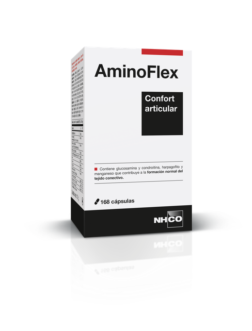 Plus d'informationsCon el paso del tiempo o el desgaste fisiológico, las articulaciones pueden perder flexibilidad y volverse más rígidas. Se pueden experimentar de forma constante o periódica incomodidad y sensibilidad con cada movimiento.La investigación NHCO Nutrition® ha desarrollado AminoFlex, una fórmula que reúne 12 ingredientes de interés:- Glucosamina y condroitina, presentes de forma natural en el cartílago.- 3 aminoácidos, incluida la metionina, un aminoácido azufrado esencial asociado a la prolina y a la glicina, 2 aminoácidos que componen el colágeno.- Plantas reconocidas como la uña de gato y el harpago to, combinadas con cúrcuma.- Minerales amino-quelados, incluyendo el zinc, que contribuye al mantenimiento normal de los huesos; el manganeso, que contribuye a la formación normal de los tejidos conectivos; y el cobre, que ayuda a mantenerlos.