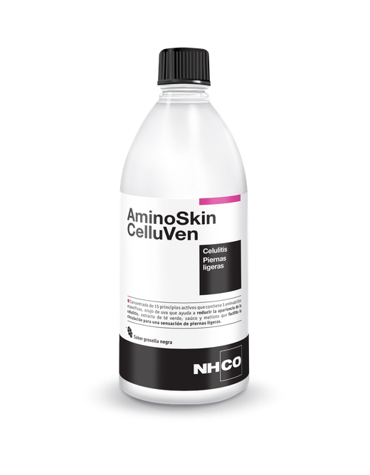 Plus d'informationsFisiológicamente, en las mujeres, las caderas, los muslos y los glúteos son zonas de acumulación selectiva de agua y grasa responsables de la aparición de los hoyuelos típicos de la piel de naranja. Su presencia es consecuencia de factores hormonales y genéticos, así como de una mala circulación que puede llevar a una sensación de piernas hinchadas con posible retención de líquidos.NHCO Nutrition® ha desarrollado AminoSkin CelluVen una fórmula que incluye 3 complejos:- Dermolys contiene extracto de orujo de uva para ayudar a reducir el aspecto de la celulitis, cafeína y extracto de té verde.- Reversine-500 combina dos aminoácidos específicos, el dipéptido L-aspartato de L-arginina, y un extracto de meliloto que facilita la circulación para una sensación de ligereza en las piernas.- Captodrain contiene extractos de hinojo, grosella negra y saúco, éste último conocido por ayudar al control de peso.